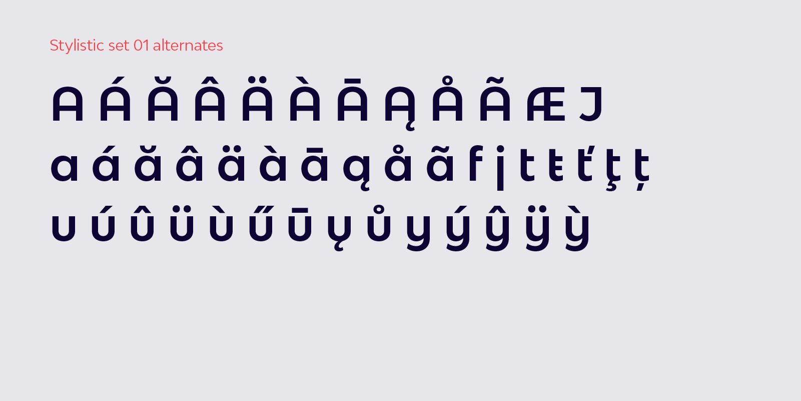 It’s available in four widths, each containing eight weights with matching oblique italics (that's 64 styles in total). The main font files include two stylistic sets allowing for more expressive options, specially for display use. SS01 and SS02 are also available as stand-alone font files, for those who would prefer to use them directly without activating the OpenType feature.